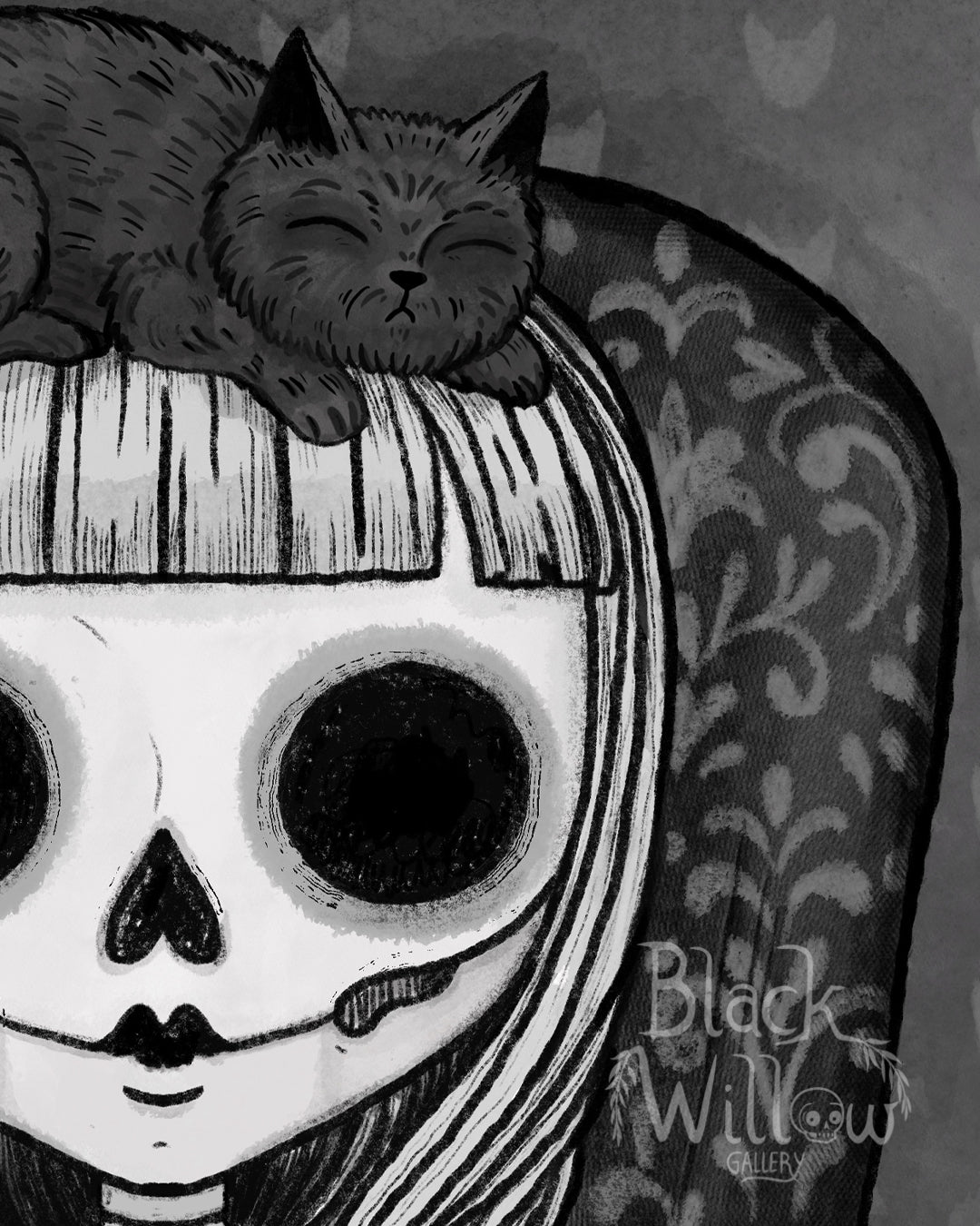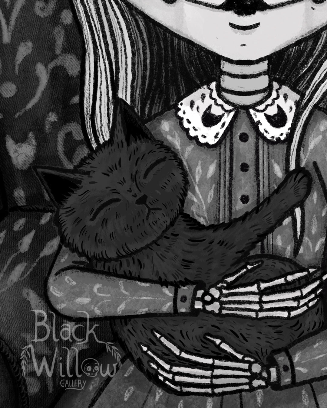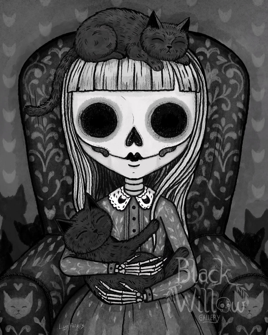 Nestled in a high-backed chair embroidered with ghostly feline silhouettes, a skeletal girl gently cradles two sleeping black cats—one curled atop her head like a crown, the other safe in her lap, embraced by delicate bone-like hands. Her hollow eyes and still expression suggest a serene otherworldly calm, as if suspended in a timeless moment of quiet affection.