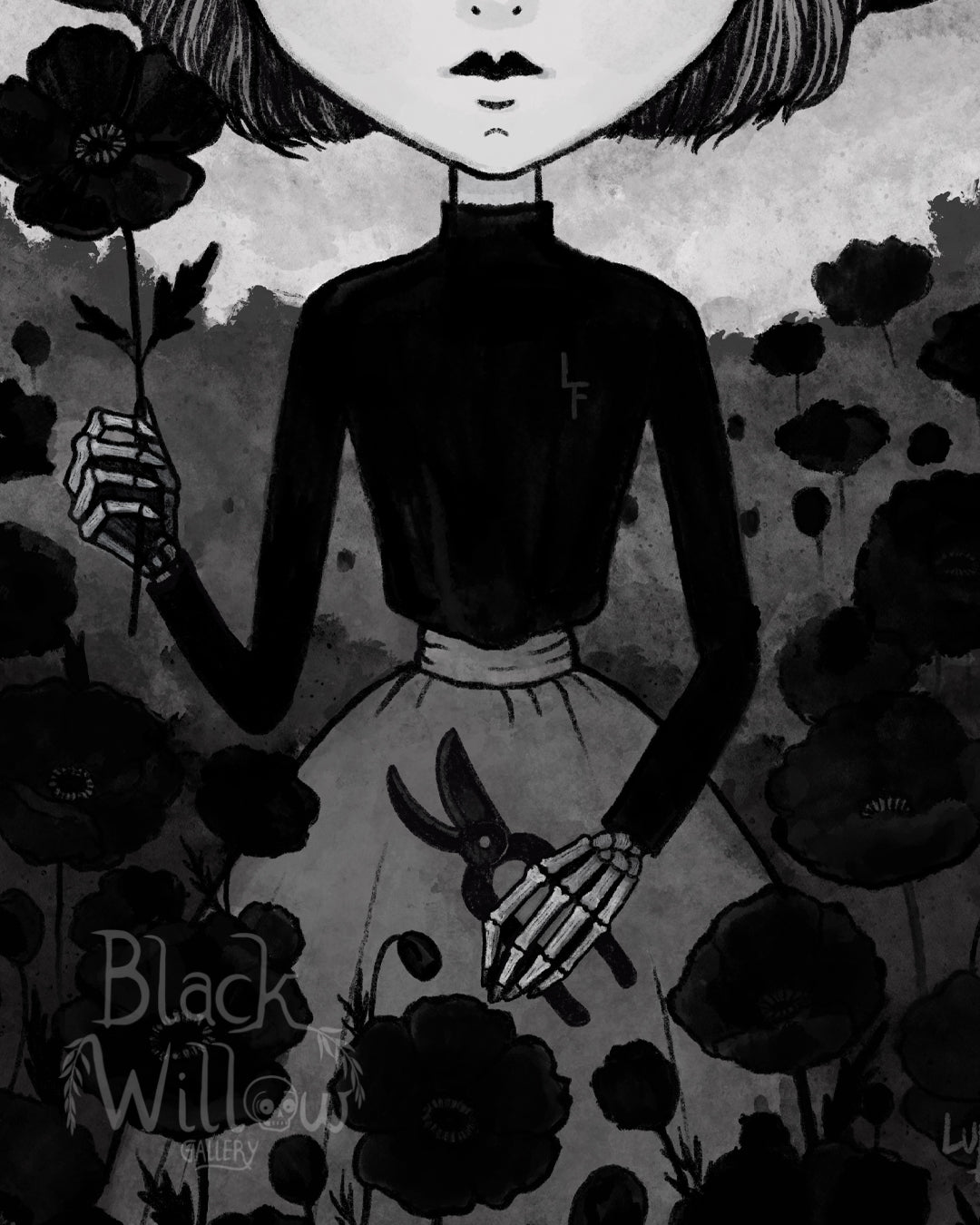 Set in a field of dark poppies under a grey sky and crescent moon, this painting explores the space between life and death, memory and release. The lone figure, holding a poppy in one hand and pruning shears in the other, becomes a quiet symbol of transition—tending to what must be remembered, and gently letting go of what must fade. It’s a meditation on grief, healing, and the fragile beauty that blooms in between.