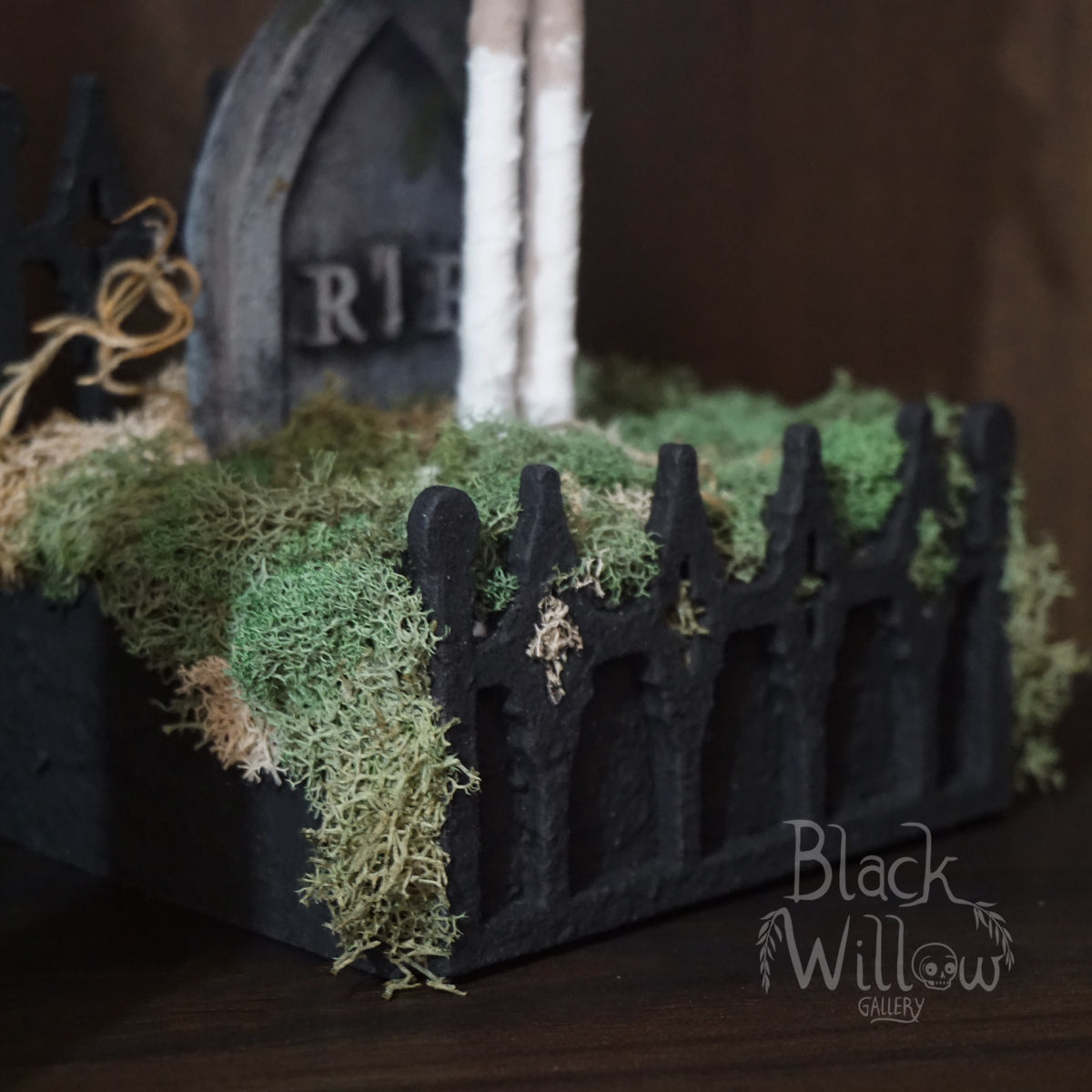 • Base measures 4" x 3.5", designed to resemble a mossy grave with iron cemetery fencing
