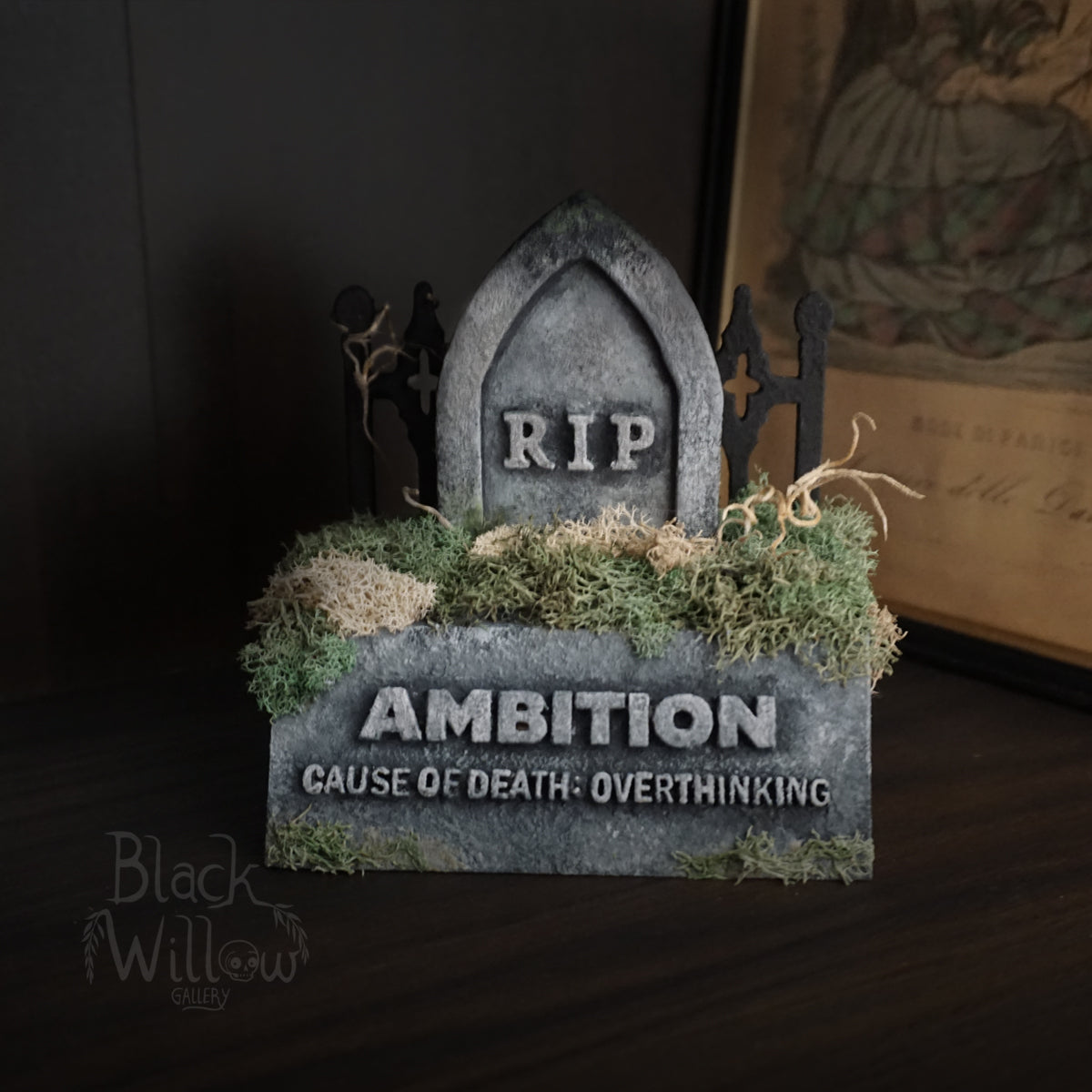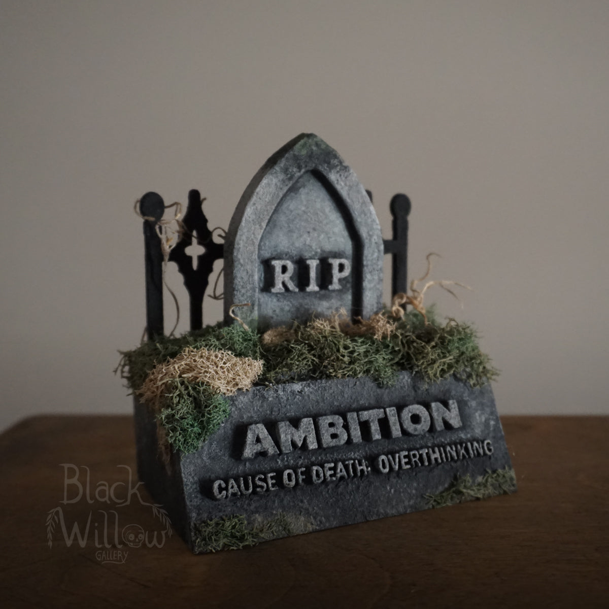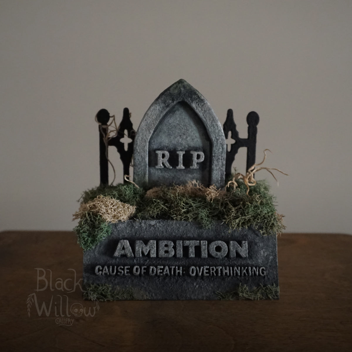 A quiet memorial for all the goals we never got around to. This miniature tombstone honors the loss of Ambition, once blazing with ideas, now resting under a soft pile of hesitation and endless to-do lists. Each tombstone is a tribute to every brilliant idea quietly crushed by the weight of “what ifs.” and overthinking.