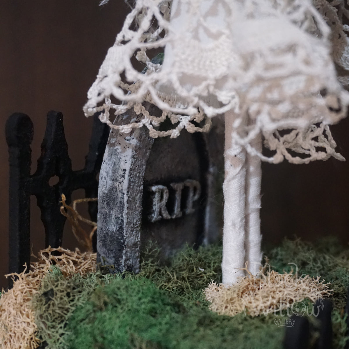 • Base measures 4" x 3.5", designed to resemble a mossy grave with iron cemetery fencing