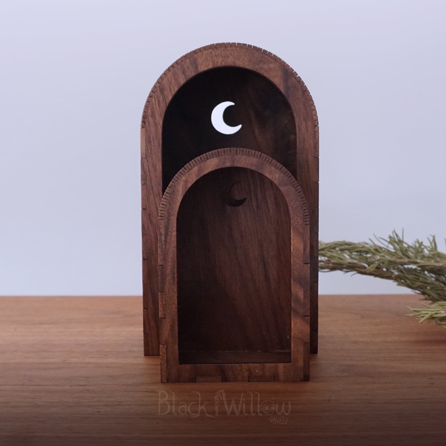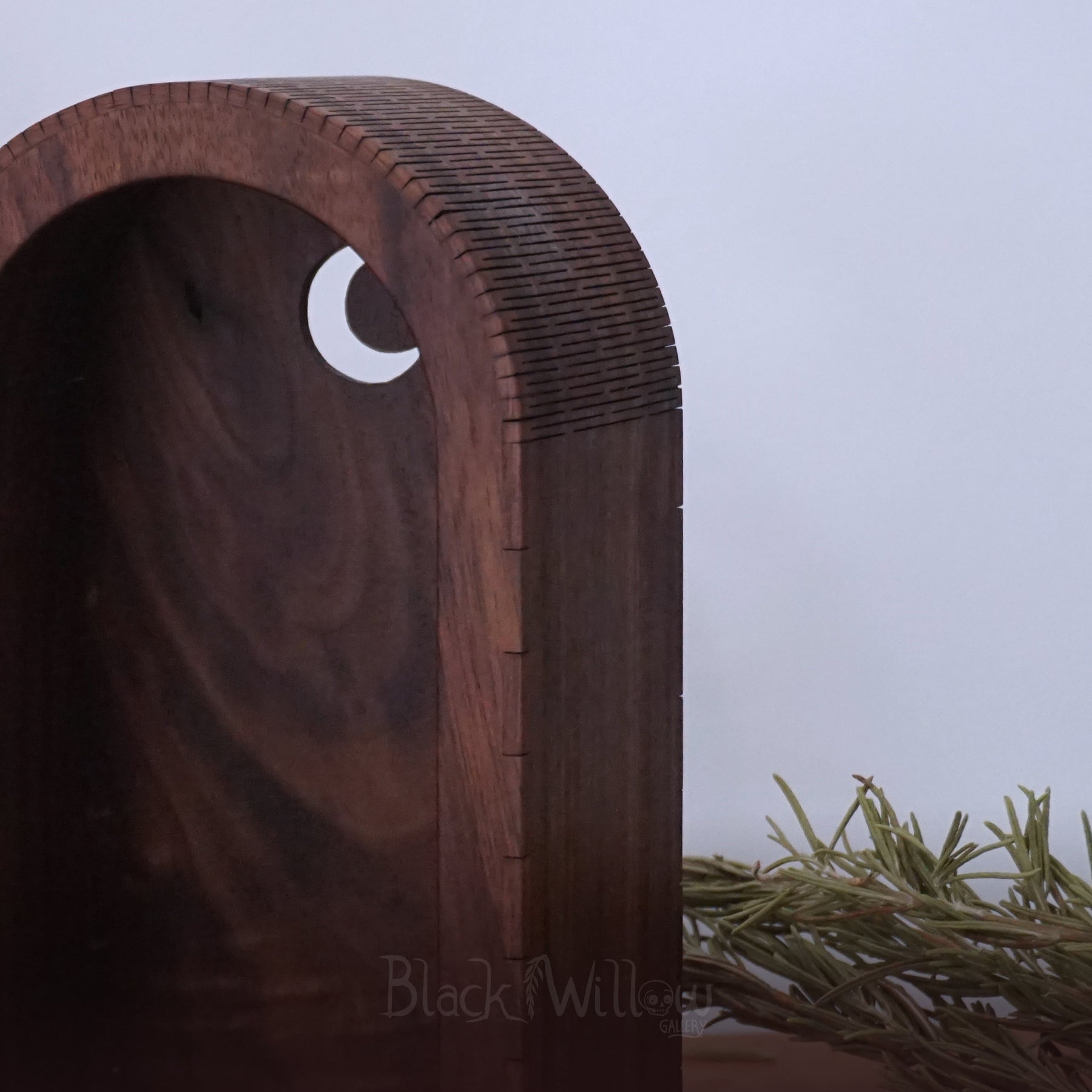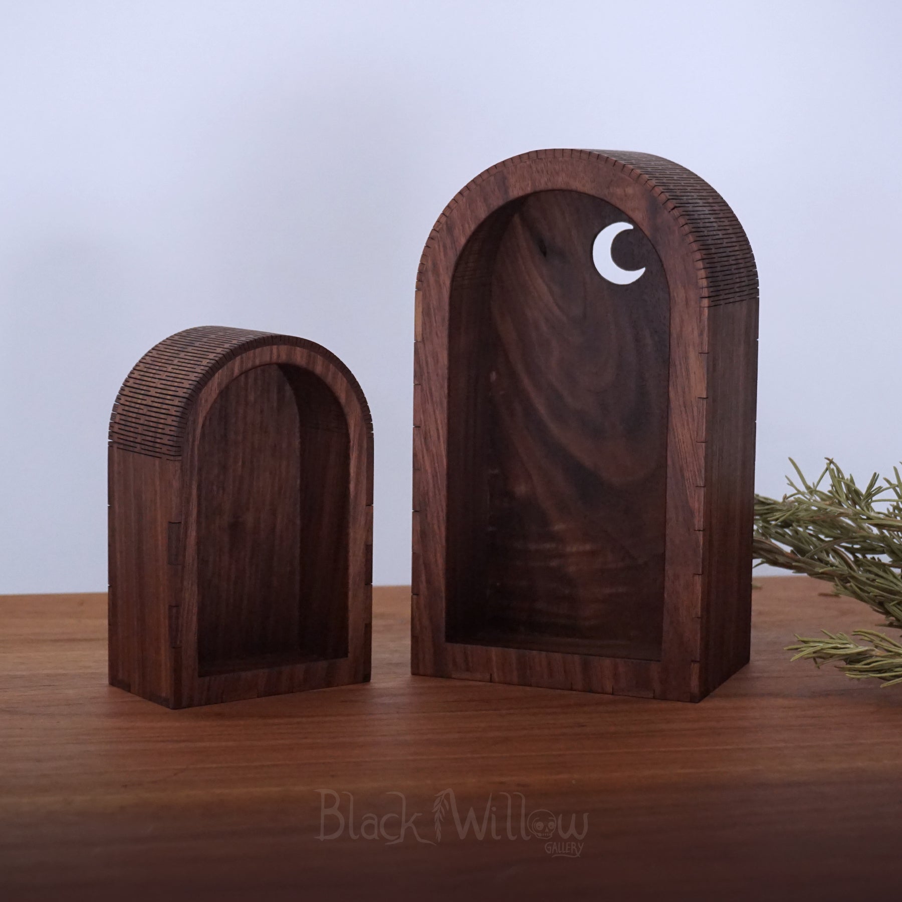 Crafted by the twisted and creative hands of Black Willow Gallery, this eerie niche has been designed, cut, sanded, and painted to perfection. Nicho will have natural knots, dents and each nicho has it's own grain pattern and color.