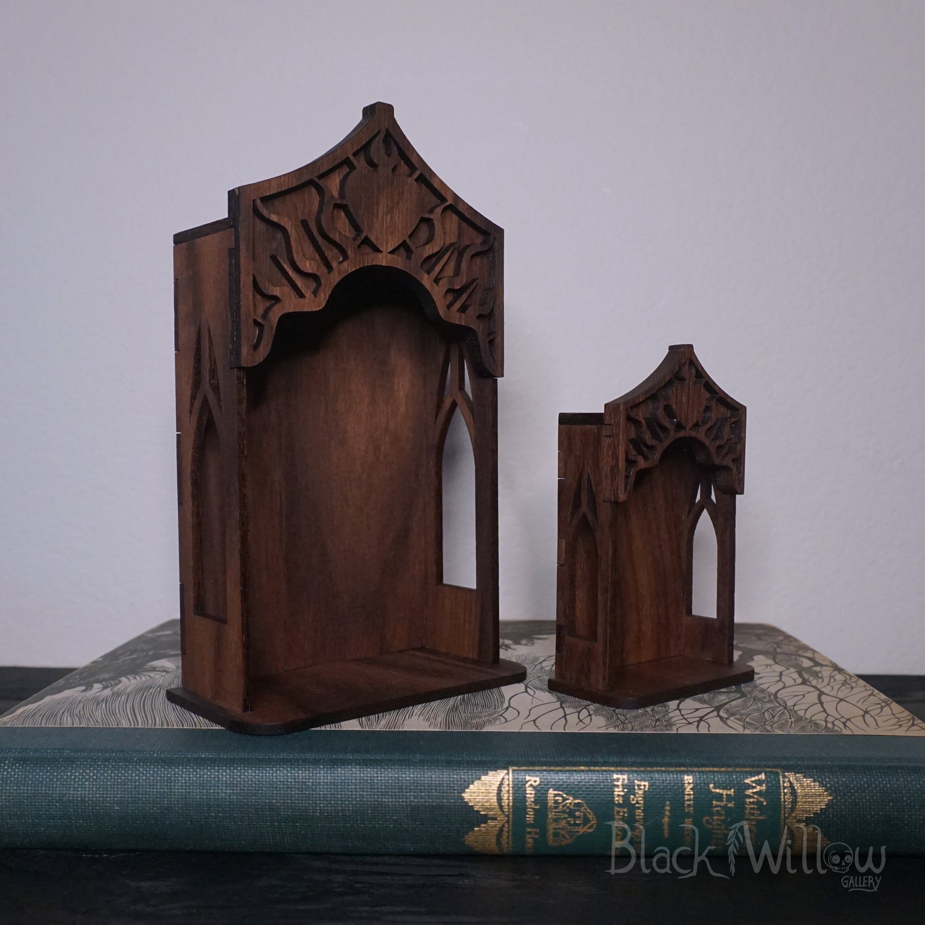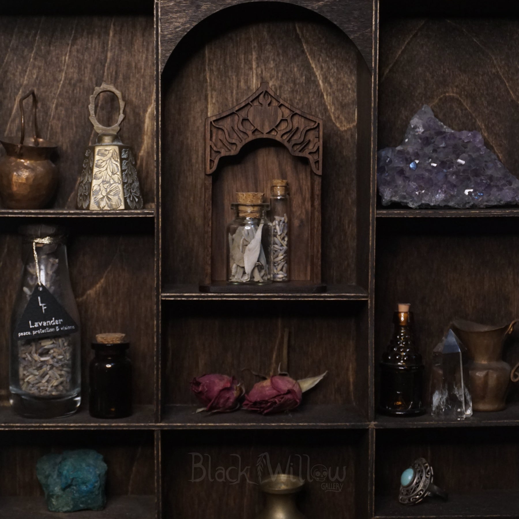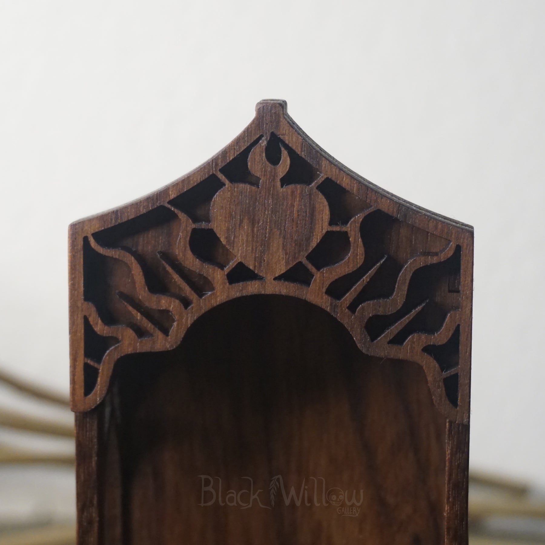 Experience the mystique of our Sacred Heart Niche, expertly crafted from solid walnut wood. This small yet striking piece is perfect for displaying your apothecary, oddities, and tiny trinkets.